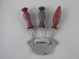 Stainless cheese planes, with handles made from laminated hardwoods, individually hand-turned on a lathe, in an assortment of shapes and colors. The woods have not been dyed; these are the natural